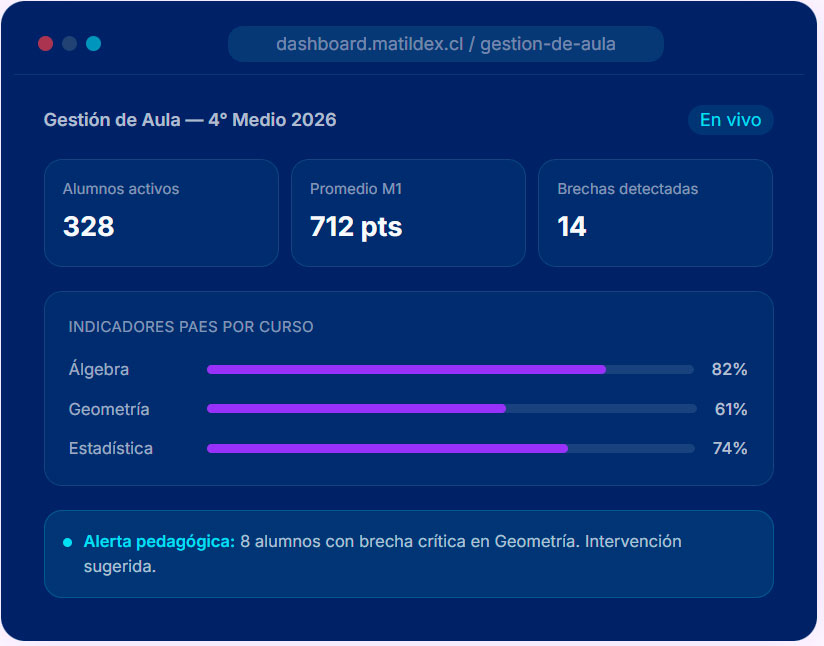 Entrega visibilidad total a la dirección sobre los vacíos de aprendizaje de cada curso, permitiendo intervenciones pedagógicas precisas y basadas en datos reales.